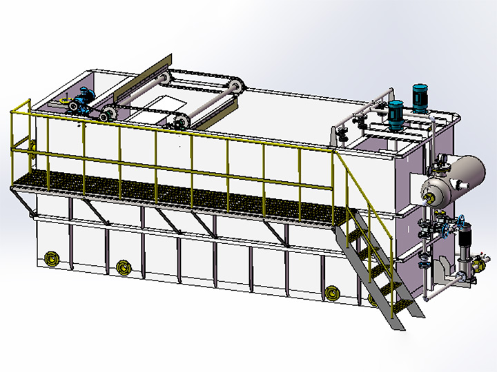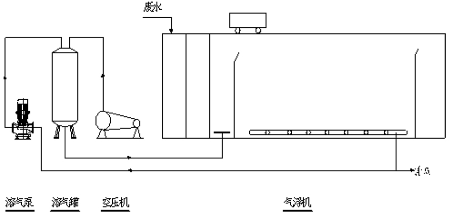 該裝置主要起固液分離作用,去除廢水中的懸浮物(SS)、油污、色度,同時可以降低COD、BOD等污染物,主要利用溶氣系統產生的溶氣水中的微氣泡,與水中的懸浮物絮體碰撞粘合在一起,形成“微小氣泡—懸浮物復合體”,該“微氣泡—懸浮物復合體”逐漸共聚,體積變大,形成比重小于1的“氣泡—懸浮物復合體”。溶氣水在 0.3-0.5MPa的工作壓力的情況下,使空氣Max限度地溶入水中,通過減壓釋放,形成直徑在20μm-30μm左右的微小氣泡。