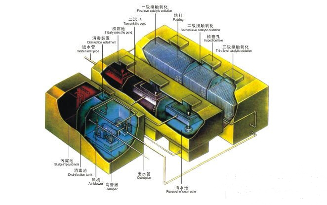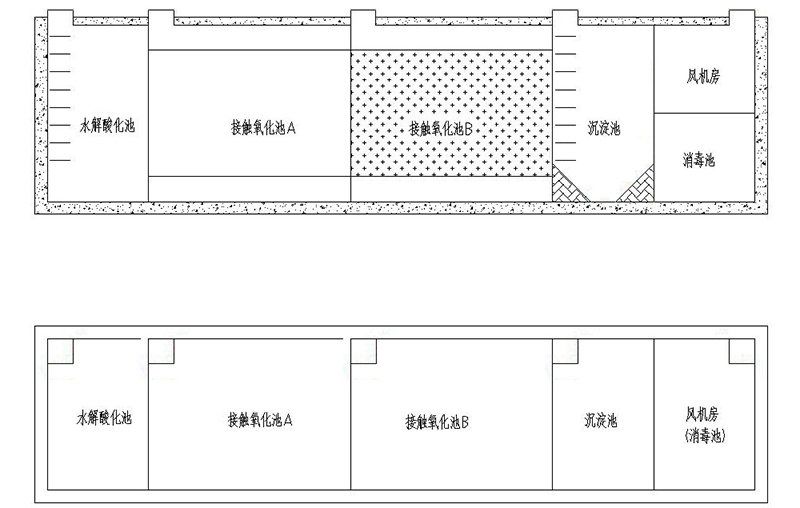 反應(yīng)池采用了生物觸氧化法,僅需三個(gè)月(90天)左右排一次泥(用糞車(chē)抽吸或脫水成泥餅外運(yùn))。